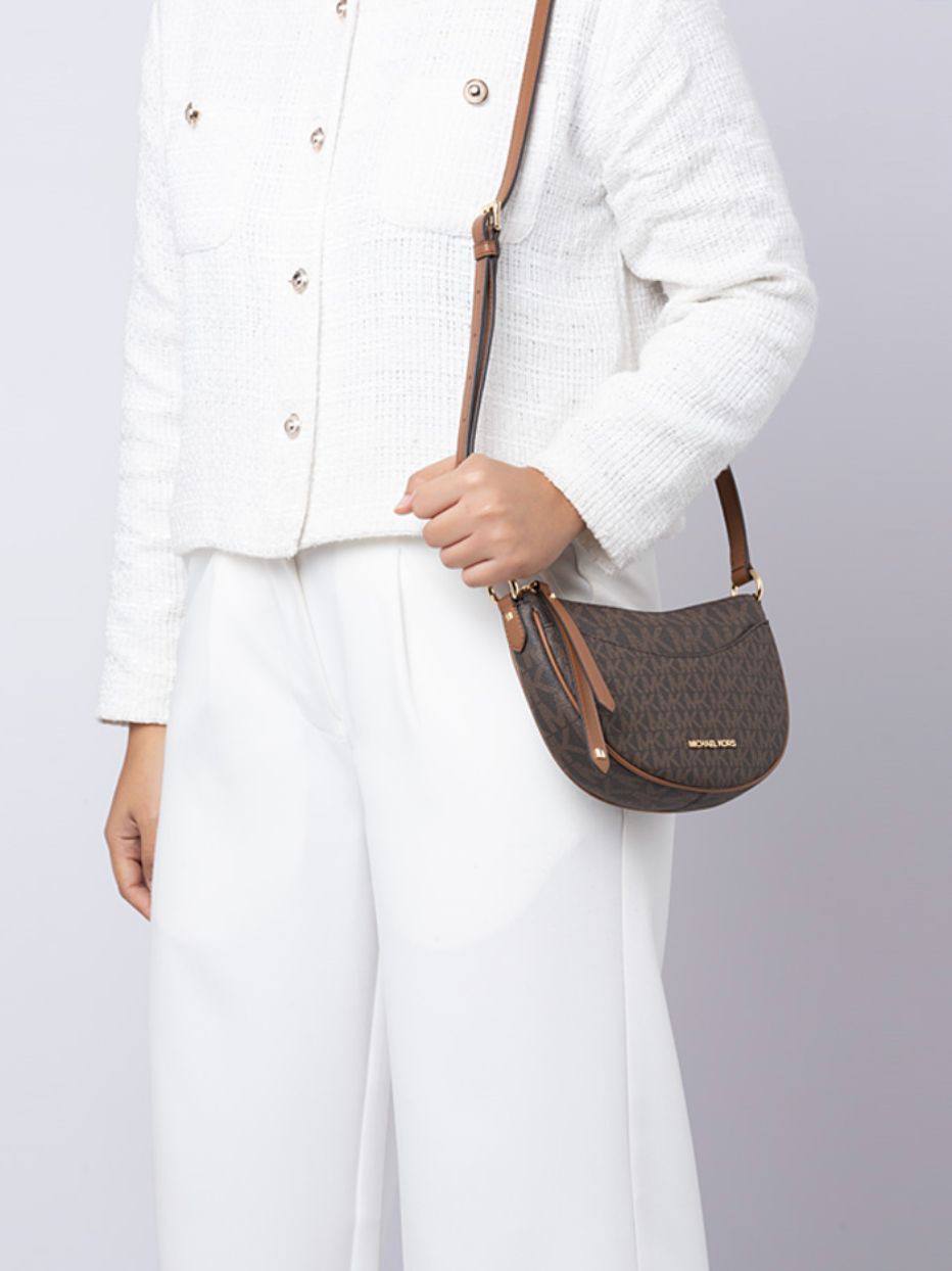 AUTHENTIC/ORIGINAL Preloved MK Signature Dover Small Half Moon Crossbody Bag Brown