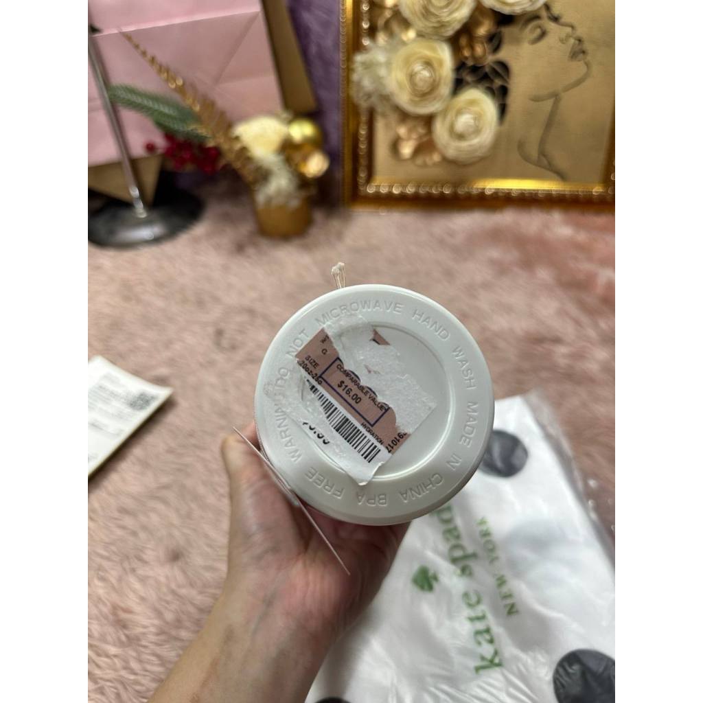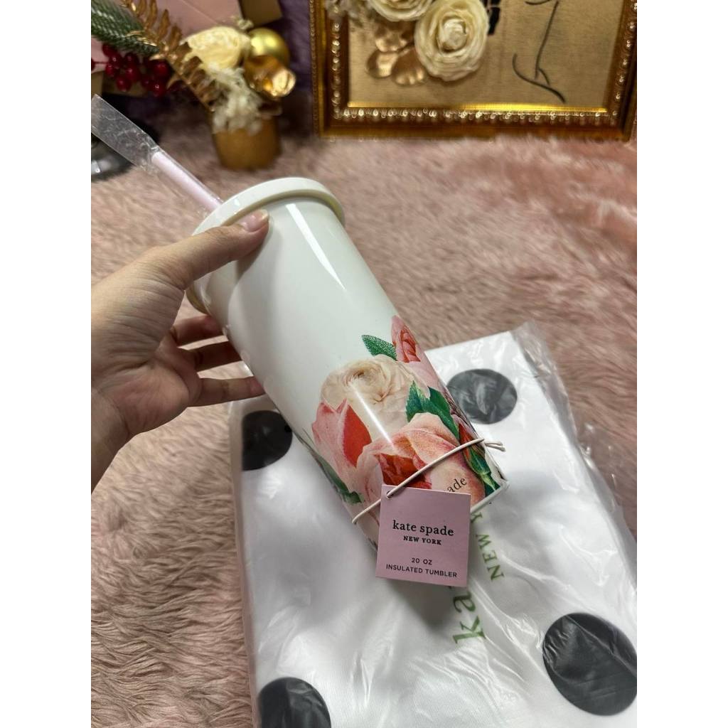 PREMIUM DESIGN - Tumbler is featured in white with a floral edging and the metallic gold saying, "bridesmaid". The Kate Spade New York logo is printed on the back near the base.