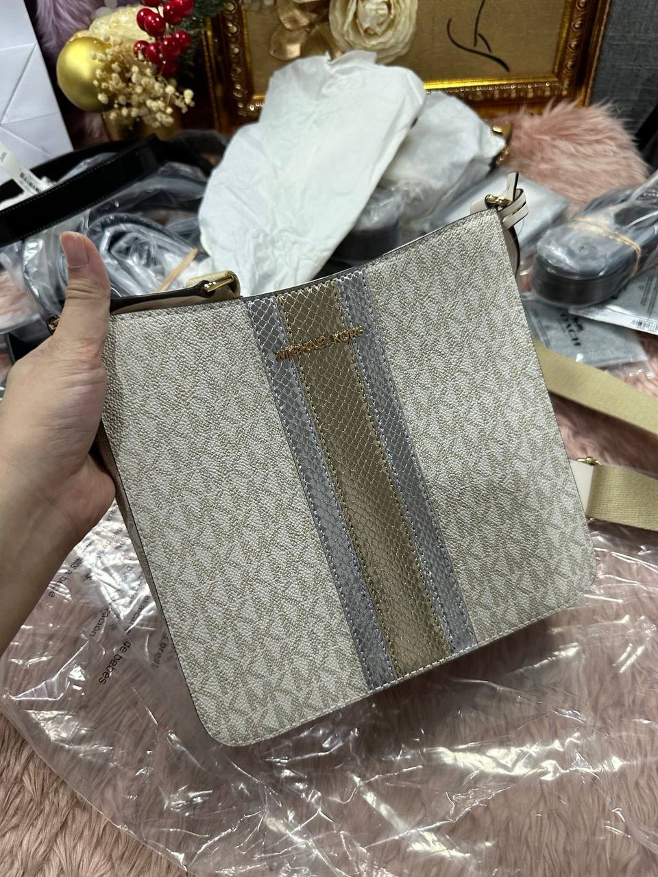 ORIG & IMPORTED Michael Kors MK Jet Set Travel Small Signature Logo and Metallic Messenger Bag Oxblood/Vanilla White